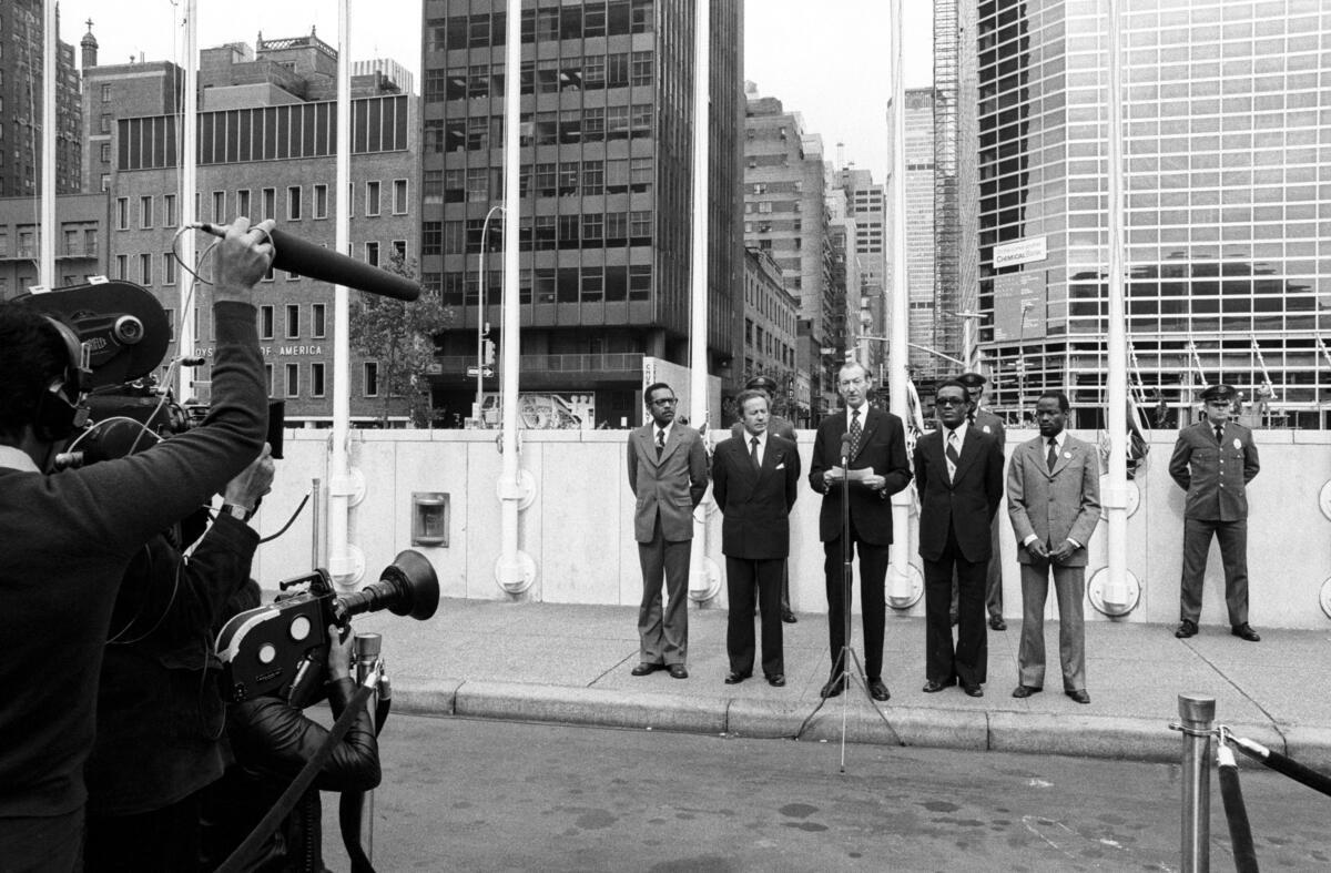 Secretary-General Kurt Waldheim making a statement at the ceremony. Left to right: Abilao Augusto Monteiro Duarte, Foreign Minister of Cape Verde; Assembly President Gaston Thorn (Luxembourg); Mr. Waldheim; Miguel Torovoada, Prime Minister of Sao Tome and Principe; and Joaquim Alberto Chissano, Foreign Minister of Mozambique.