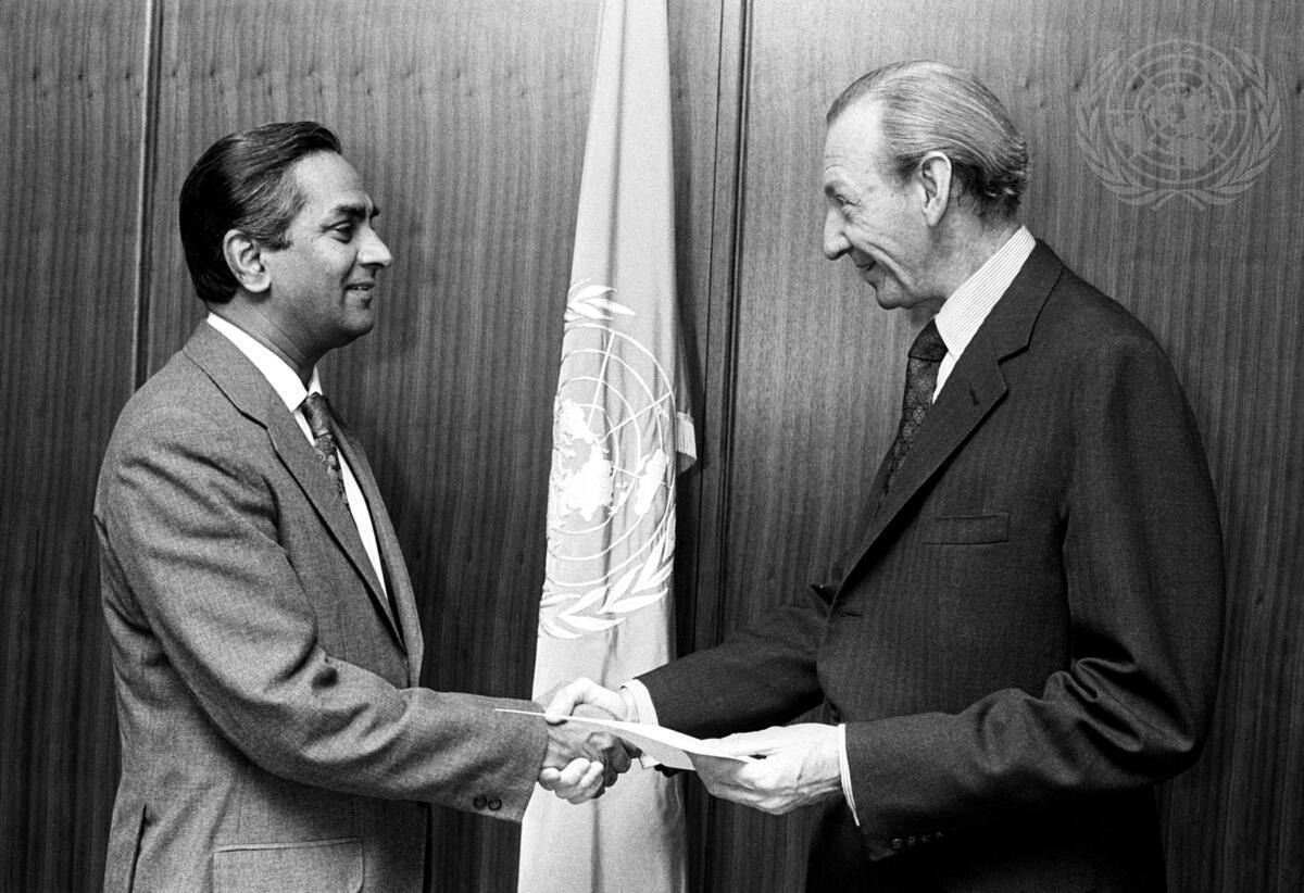 The new Permanent Representative of India to the United Nations, Rikhi Jaipal, is seen presenting his credentials to Secretary-General Kurt Waldheim at United Nations Headquarters today.