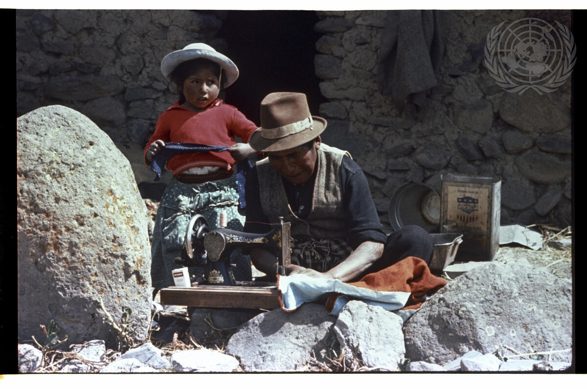 Two vocational training centres have been established by the Government of Peru in the Department of Puno in the Lake Titicaca area with technical and financial help from the Andean Indian Programme. A rural worker or campesino on the farm at one of the centres - the Centro de Capacitacion at Chucuito. He has learned to operate a sewing machine and makes clothes when he is not tending the farm. One of the principal tasks the international community has set itself for the 1970's is to help provide work and the skills needed for work for all the people in the world who at present have neither.