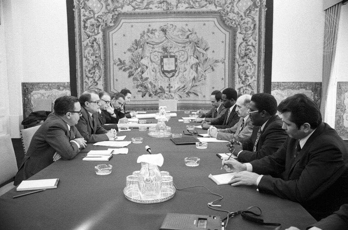 The Visiting Mission held a working session at the Ministry of Foreign Affiars in Lisbon on 24 February. The Mission members were briefed on the political, economic and social conditions in Cape Verde by a delegation from the Portuguese Government. Left to right: Sergio Sacadura Cabral, Deputy Director-General of Political Affairs; Magalhaes Cruz, Director-General of Political Affairs; Luis Abecassis, Manuel Vidigal, General Inspectors, Ministry of Inter Territorial Co-ordination; Cravo Silva, Director, Ministry of Inter Territorial Co-ordination; Gilberto Schlittler-Silva, Principal Secretary, Visiting Mission; Noumou Diakite (Mali), Haissam Kelani (Syria); Vincent David Lasse (Trinidad and Tobago); and Stanislav Suja (Czechoslovakia).