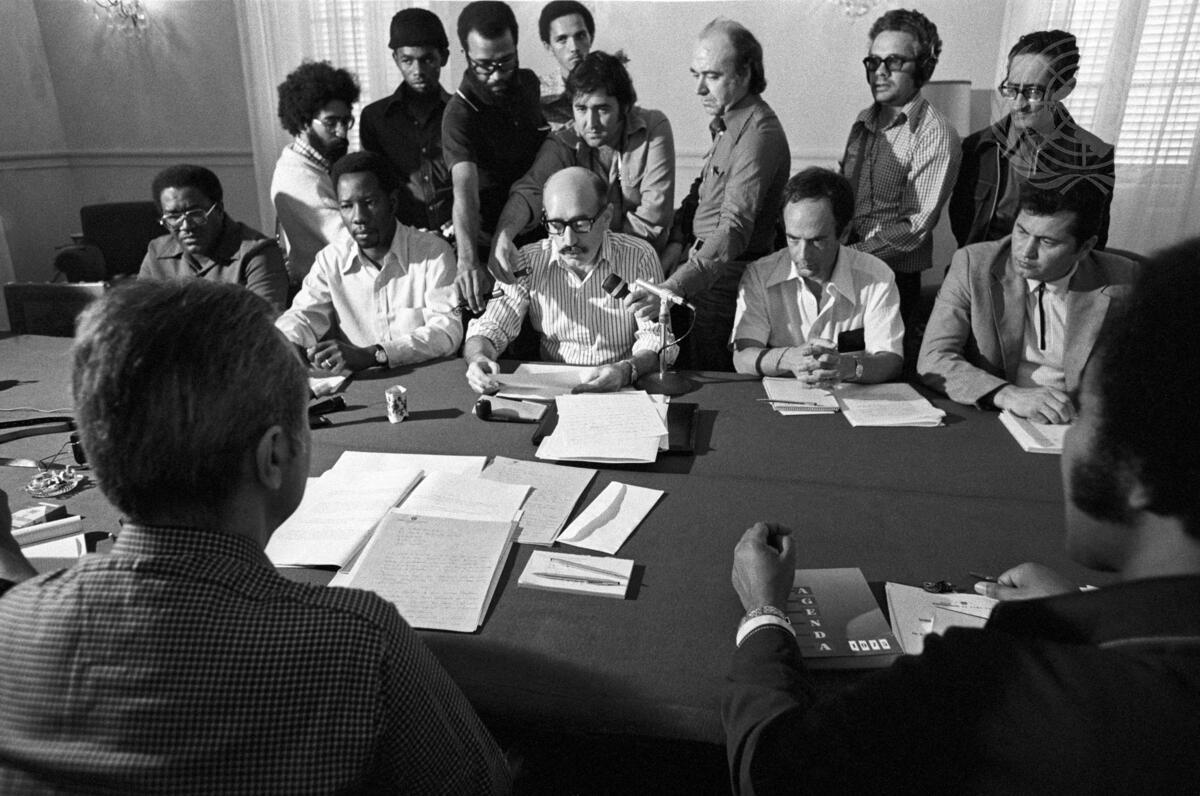 Here, Haissam Kelani (Syria), Chairman of the Mission, is seen making a statement to the press at the conclusion of a working session with members of the Transitional Government at the Governor’s Palace in Mindelo, Sao Vicente Island. Left to right: Vincent Lasse (Trinidad and Tobago), Noumou Diakite (Mali), Mr. Kelani, Gilberto Schlittler-Silva, Principal Secretary, and Stanislav Suja (Czechoslovakia). At left, back to camera, is Vincente Almeida D’eca, High Commissioner in Cape Verde.