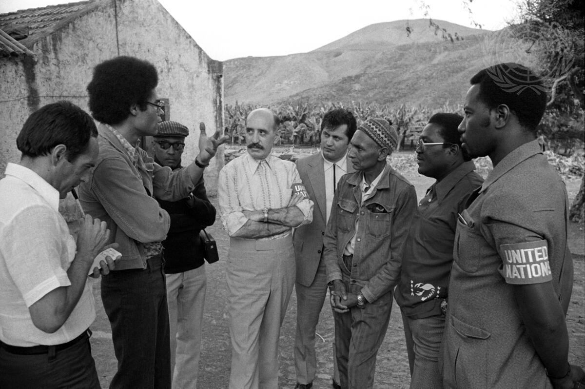 Members of the Visiting Mission toured in Praia, Santiago Island, on 26 February and visited a banana plantation located 50 km. outside Praia and owned and operated by a workers’ co-operative. Seen here, from left: Gilberto Schlittler-Silva, Principal Secretary of the Mission; Corentino Santos, Deputy Secretary, Ministry of Economic Affairs; unidentified co-operative member, Haissam Kelani (Syria); Stanislav Suja (Czechoslovakia); Mario Graga, President of the Banana Workers’ Co-operative; Vincent Lasse (Trinidad and Tobago); and Noumou Diakite (Mali).