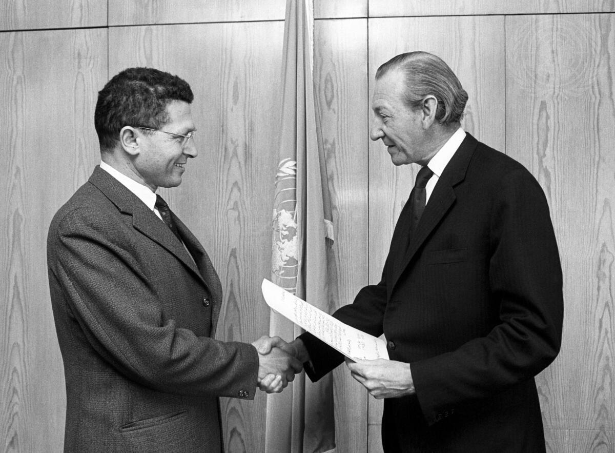 Mansur Rashid Kikhia, the new Permanent Representative of Libya to the United Nations, presenting his credentials to Secretary-General Kurt Waldheim at United Nations Headquarters today.