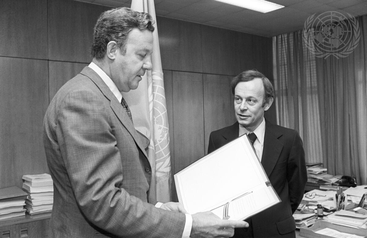 Ireland’s United Nations Ambassador Noel Dorr (right) deposits the instrument of accession with UN Legal Counsel Erik Suy.