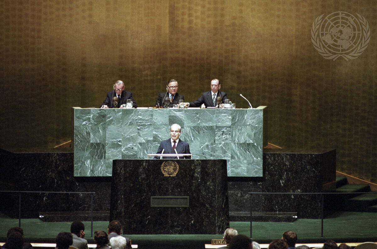 Secretary-General-designate Javier Pérez de Cuéllar addressing the General Assembly from the rostrum after taking the oath of office this morning. Seated on the podium behind him are, from Ieft, Secretary-General Kurt Waldheim, General Assembly President Ismat T. Kittani (Iraq), and Under-Secretary-General for Political and General Assembly Affairs William B. Buffum.