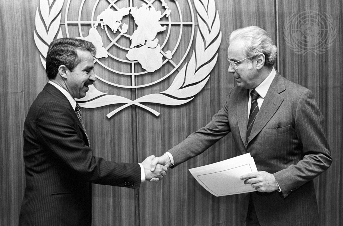 Ali A. Treiki (left), Libya's new Permanent Representative to the United Nations, presenting his credentials today to Secretary-General Javier Perez de Cuellar at Headquarters.