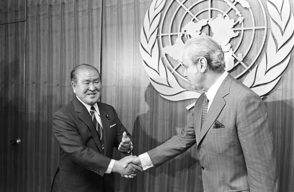 Secretary-General Javier Perez de Cuellar (right) greeting Japan’s Prime Minister Zenko Suzuki at the start of their meeting at Head-quarters today. Prime Minister of the only nation that has ever been under atomic attack, Mr. Suzuki is scheduled to address the second special session of the General Assembly on disarmament today.