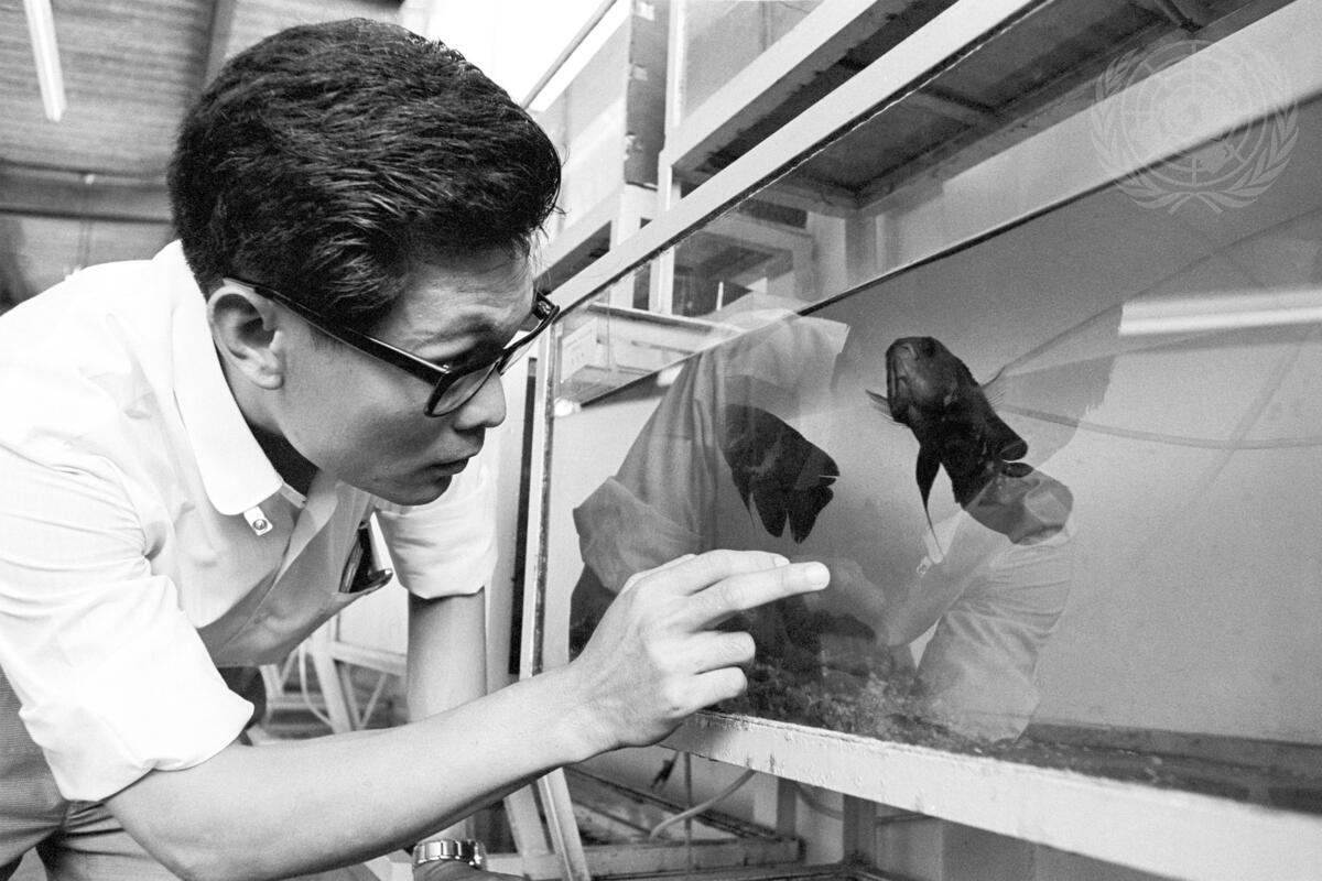 Research in aquarium fish breeding, a fast growing commercial field, is also being carried out by the Singapore Government’s Primary Production Department. Han Chow Fong, a senior fisheries officer, examines a fish in the aquarium.