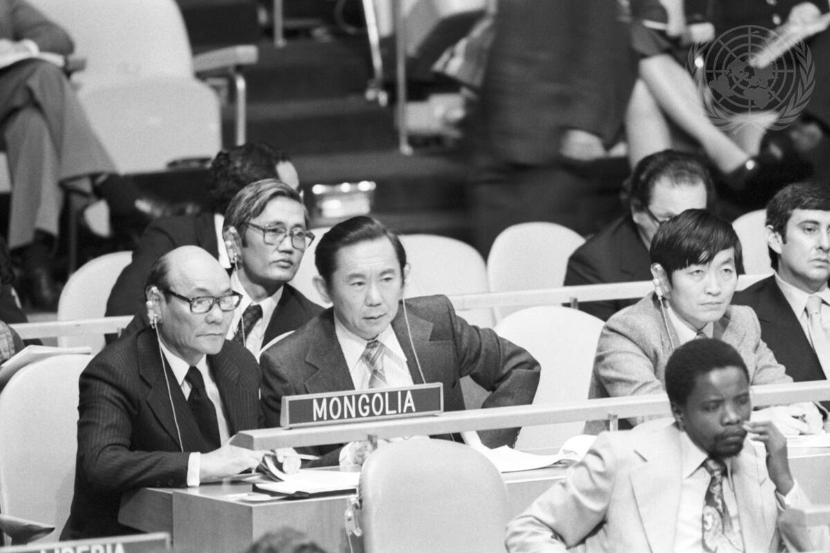 Seeh here is the delegation of Mongolia headed by Mangalyn Dugersuren (left), Minister for Foreign Affairs. Seated next to him is Tsevegzhavyn Puntsagnorov, Permanent Representative to the UN.