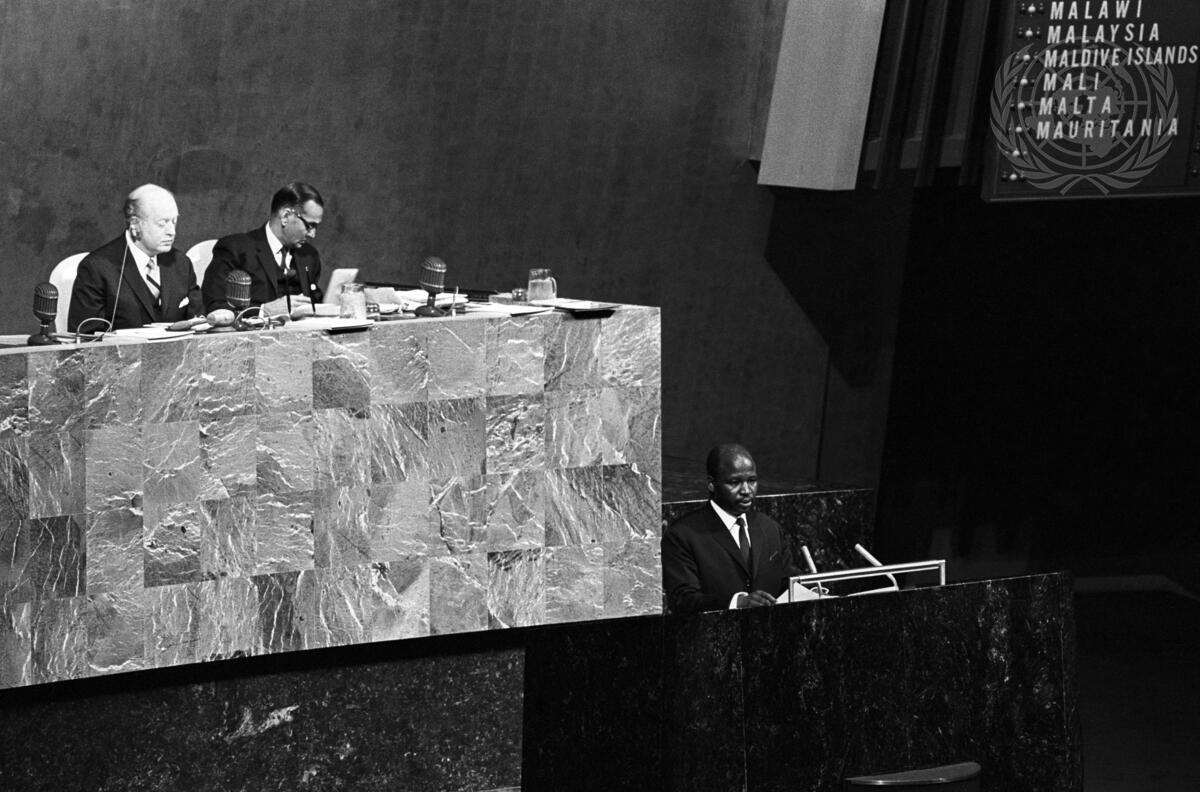Celestin Kabanda (at speaker’s rostrum), Permanent Representative of Rwanda, addressing the Assembly. At the presidential rostrum are Hannes Kjartansson (left) of Iceland, and Assembly Vice-President, presiding during part of this morning’s meeting, and C.V. Narasimhan, Under-Secretary for General Assembly Affairs and Chef de Cabinet.