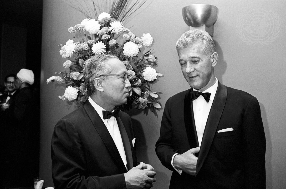Secretary-General U Thant (left) conversing with Assembly President Corneliu Menescu (Romania).