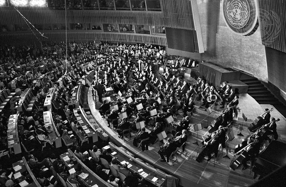 The thirty-first birthday of the United Nations was marked by a concert in the General Assembly hall on Sunday afternoon, 24 October. The National Symphony Orchestra of Washington, D.C. appeared under the direction of Antal Dorati. The soloists were Marian Anderson, as the narrator in Aaron Copland's composition ""Lincoln Portrait"", and Lazar Berman, the Soviet Pianist, in Tchaikovsky’s ""First Piano Concerto"". In addition to the works by Copland and Tchaikovsky, the programme included Beethoven's Egmont Ovetture and the Daphnis and Chloé Suite No. 2 by Ravel.