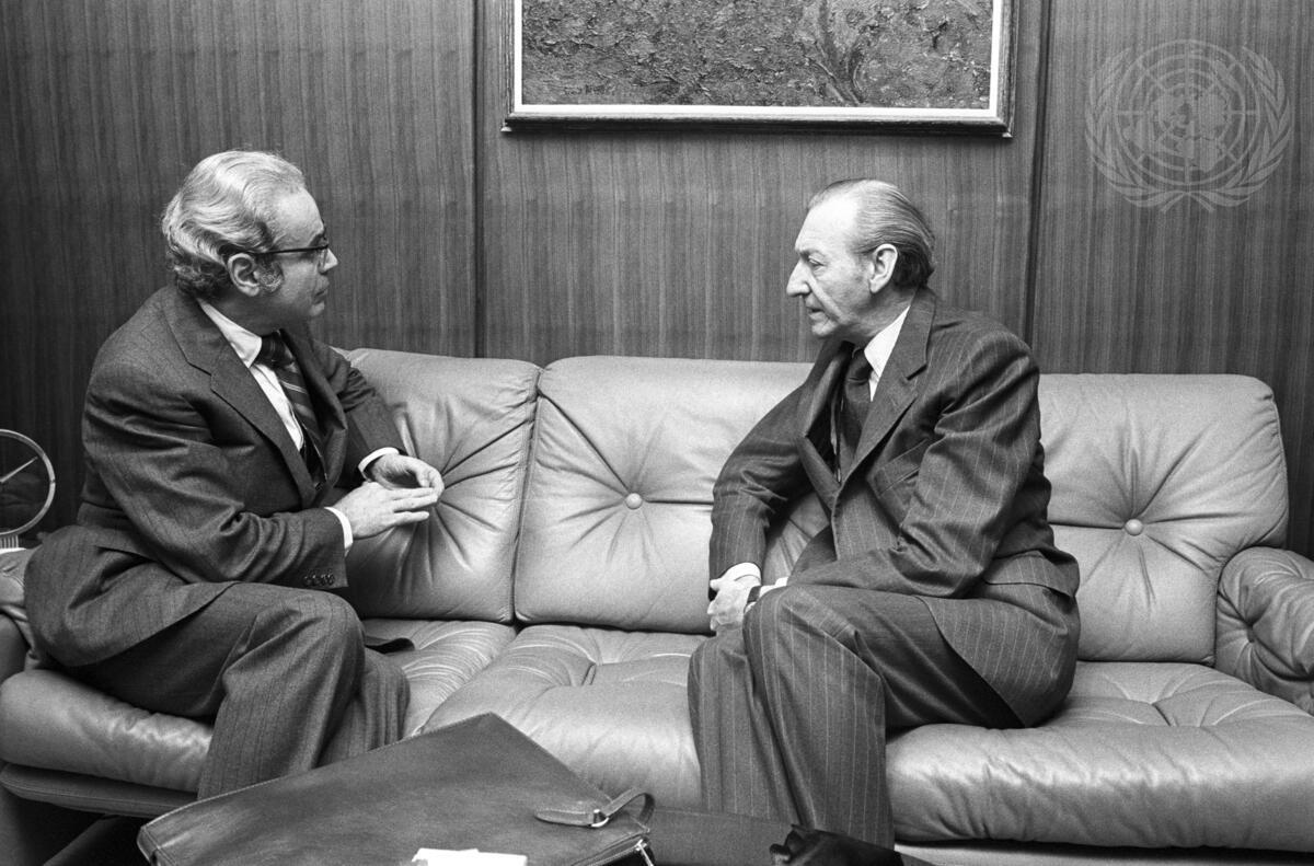 Ambassador Javier Perez de Cuellar (left), of Peru met with Secretary-General Kurt Waldheim today at United Nations Headquarters. Mr. de Cuellar is due to leave for Nicosia shortly as the Secretary-General's new Representative in Cyprus.