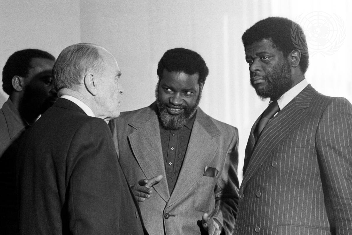 Exchanging views outside the Security Council Chamber are (left to right): Sean MacBride, Commissioner for Namibia; Sam Nujoma, President of the South West Africa People’s Organization (SWAPO); and Theo-Ben Gurirab, Representative of SWAPO in New York.