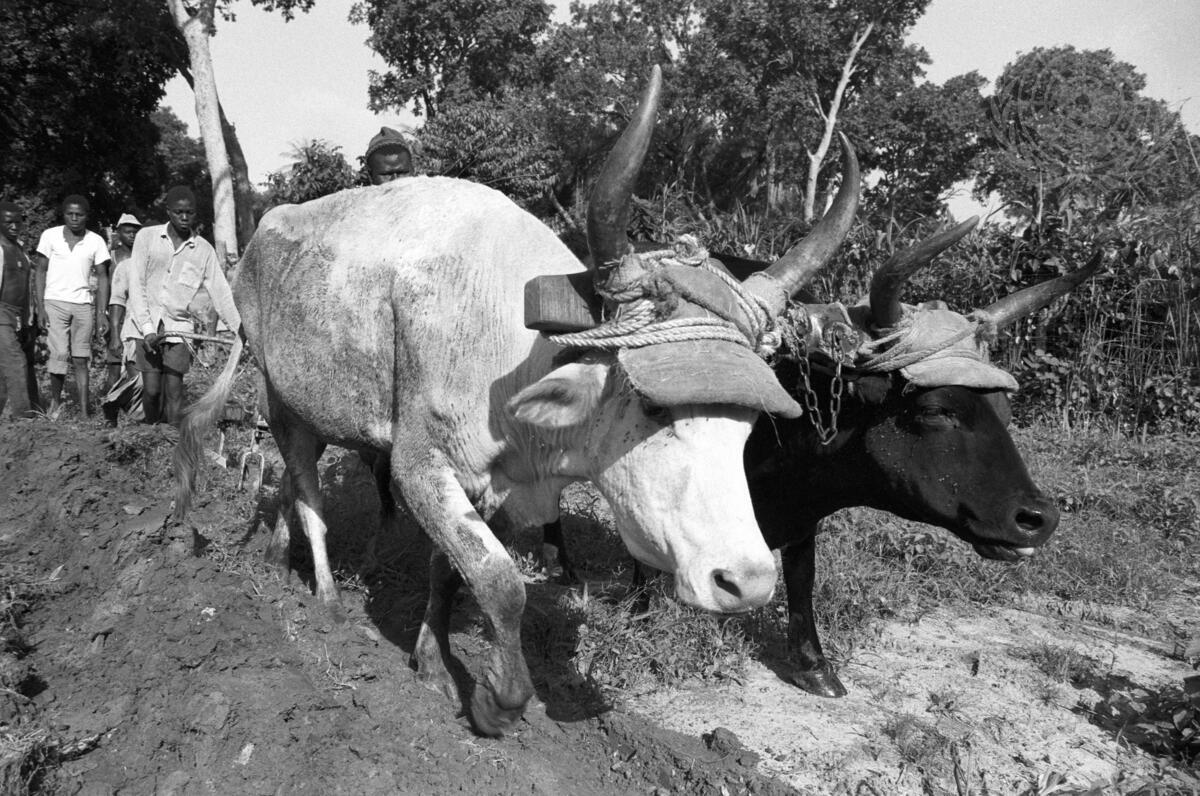 Student-farmers at the Centre for the Formation of Instructors and the Improvement of Farmers in Guerina learning to use the plough drawn by a pair of oxen. This centre was established by the Government with help from the international Labour Organization under the UN Development Programme. [No exact date]