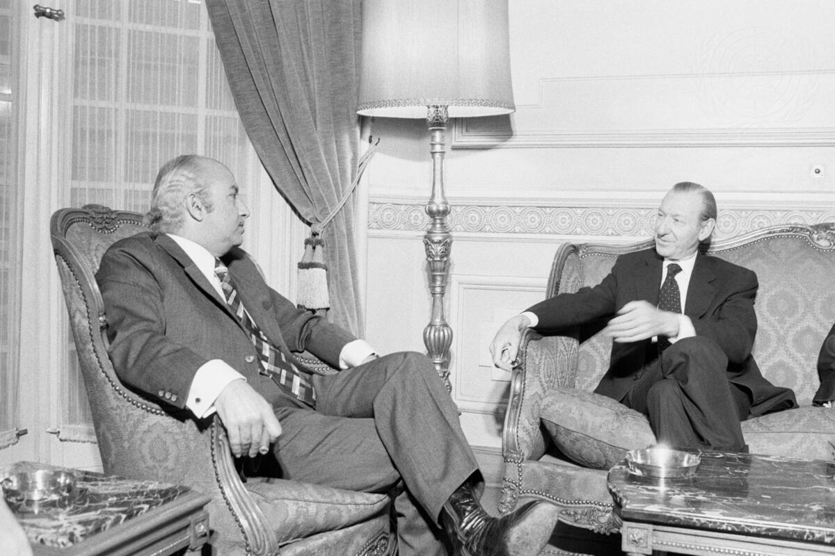 Secretary-General Kurt Waldheim (right) meets with Ismail Fahmy, Deputy Premier and Minister for Foreign Affairs of Egypt on 2 February.