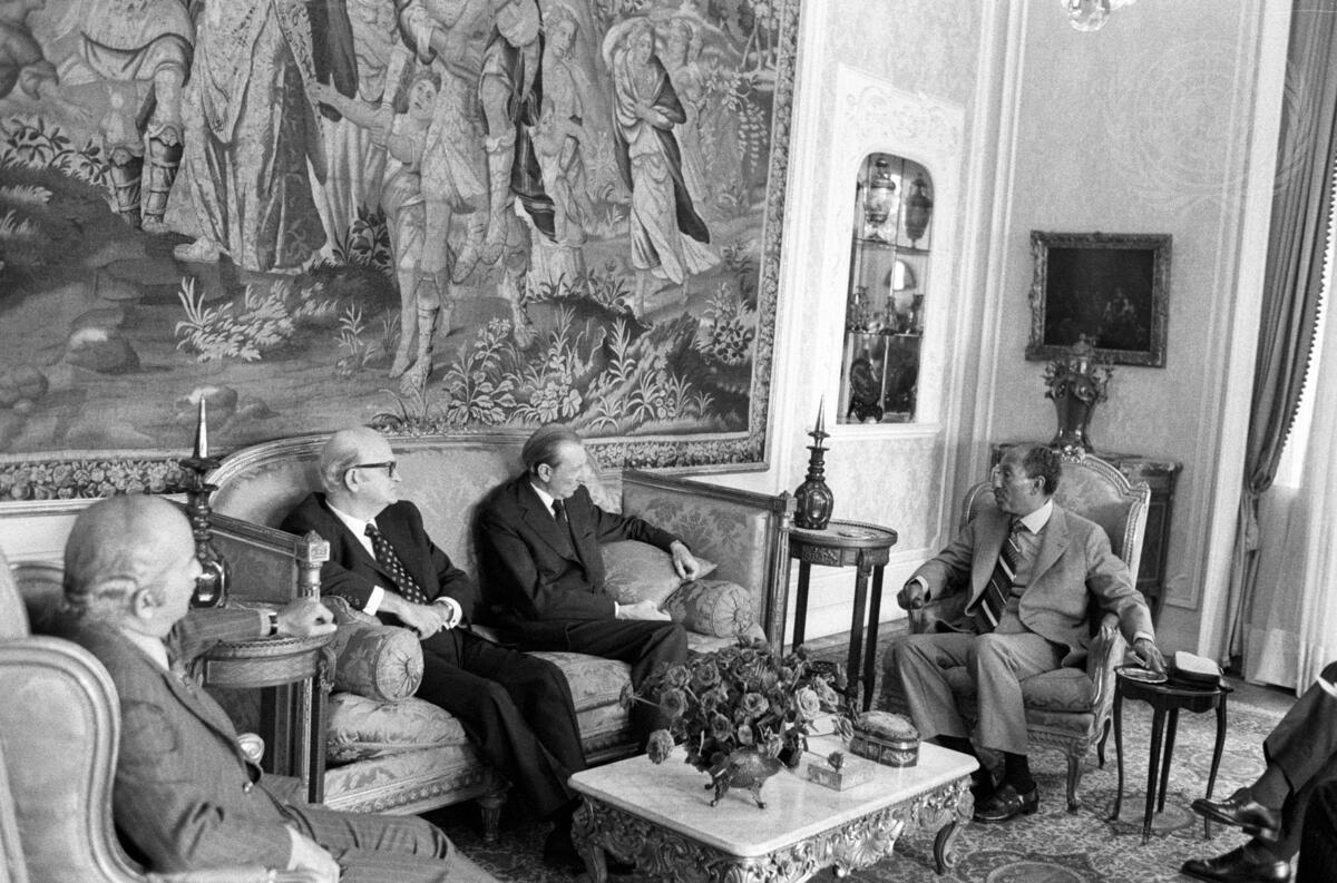 Secretary-General Kurt Waldheim (2nd from right) meets with President Anwar Sadat at his residence at Giza. To the left of the Secretary-General are Roberto E. Guyer, Personal Representative of the Secretary-General to the Geneva Peace Conference on the Middle East; and Ismail Fahmy, Deputy Prime Minister and Minster for Foreign Affairs of Egypt.