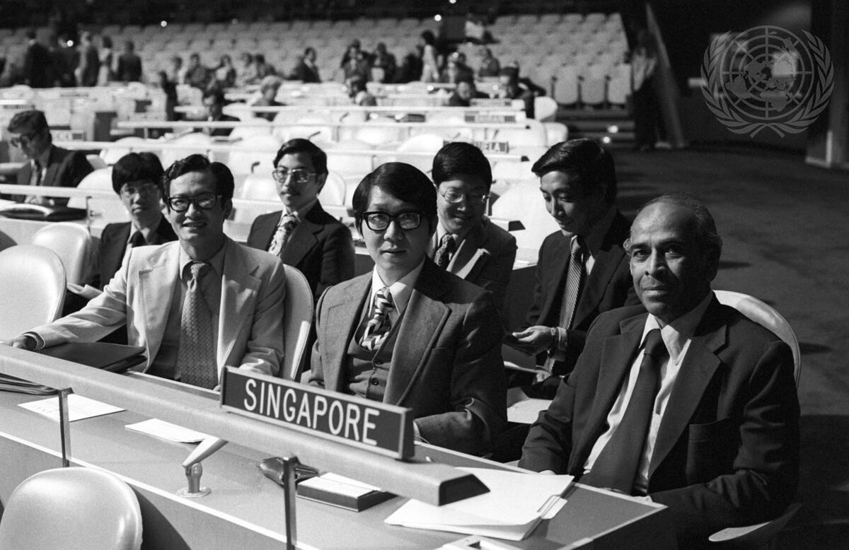 Seen here is the delegation of Singapore headed by S. Rajaratnam (right), Minister for Foreign Affairs. Seated next to him is T.T.B. Koh, Permanent Representative to the UN.