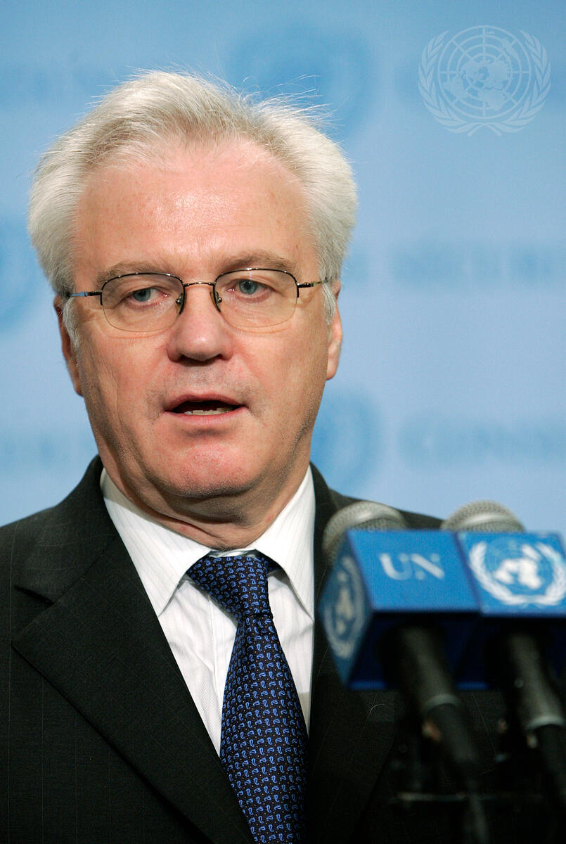Vitaly I. Churkin, Permanent Representative of the Russian Federation to the United Nations, briefs the press following the Security Council consultations on the recent Israeli attacks on Gaza.