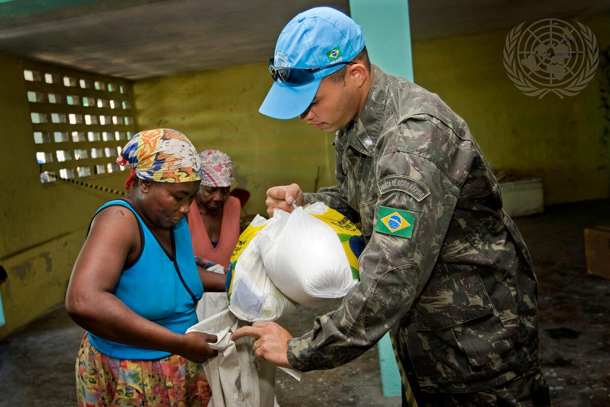 A woman receives food ration from a member of the Brazilian contingent of the United Nations Stabilization Mission in Haiti (MINUSTAH).