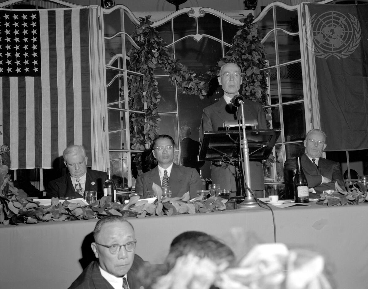 Chi-Tsai Victor Hoo, member of the Chinese Delegation speaking at a dinner for the Chinese delegates. Left to right: Mayor Lapham, T.V. Soong, Mr. Hoo, and Gov. Earl Warren. [No date]