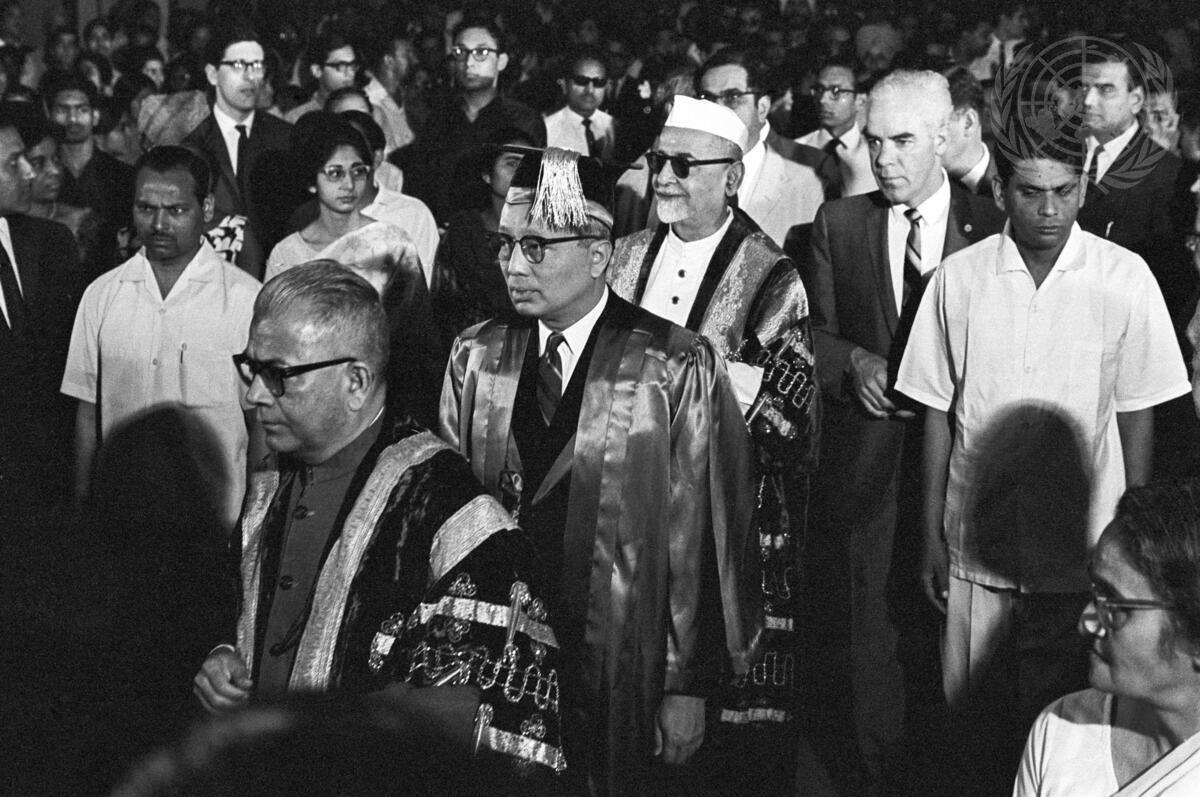 In procession into the Convocation Hall of the University of Delhi, are (left to right) B.N. Ganguli, Vice-Chancellor of the University of Delhi; UN Secretary-General U Thant; and Zakir Husain, Chancellor of the University of Delhi (white cap).