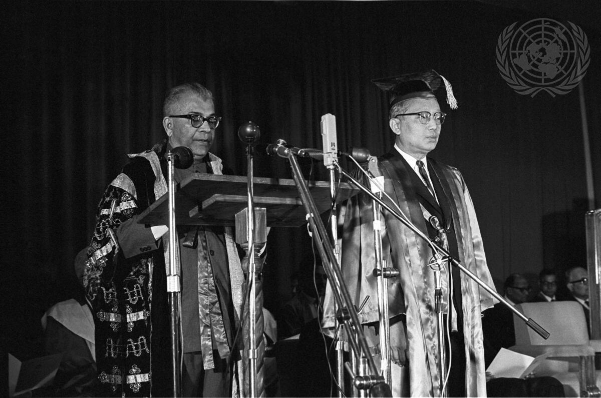B.N. Ganguli, Vice-Chancellor of the University of Delhi, delivers an address to the special convocation. On the right is UN Secretary-General U Thant.