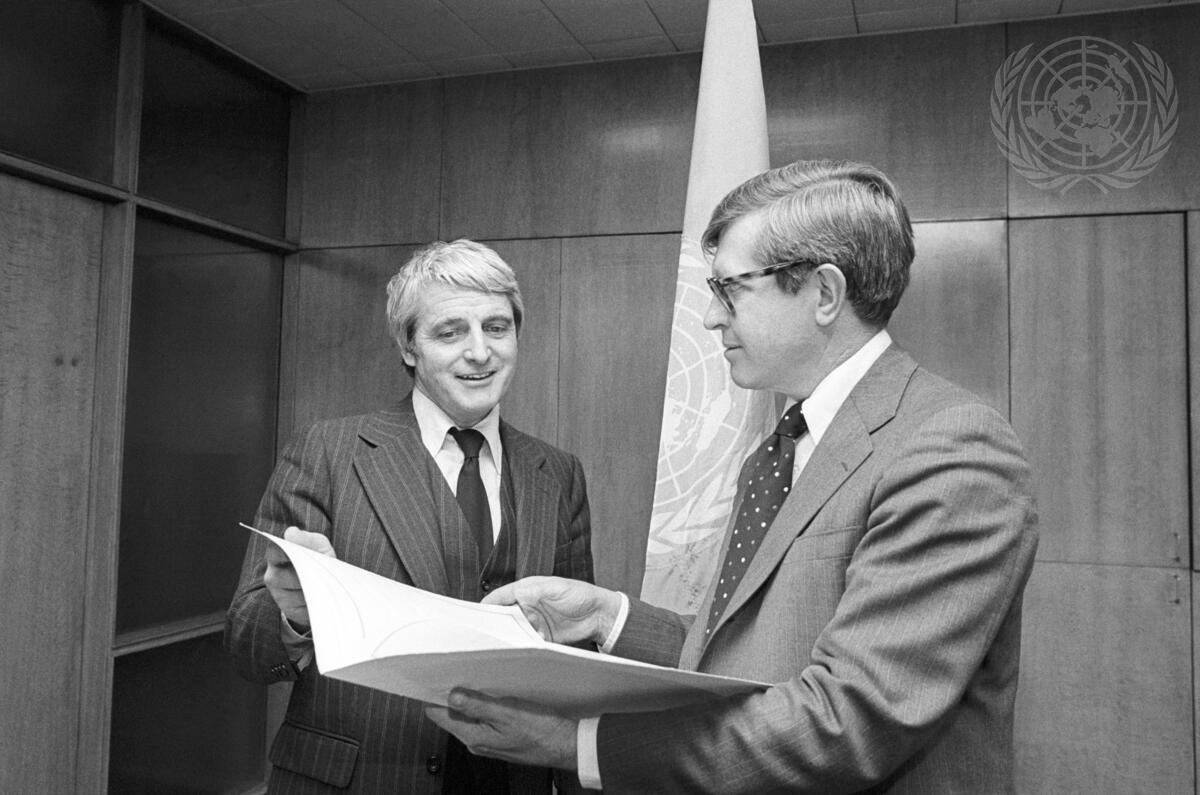 Mr. Pierre Malve (left), Head of the Delegation of the Commission of the European Communities to the UN, depositing with Mr. J.F. Scott, Acting Director of the General Legal Division, the instrument of approval of the International Cocoa Agreement, 1975, concluded at Geneva on 20 October 1975.