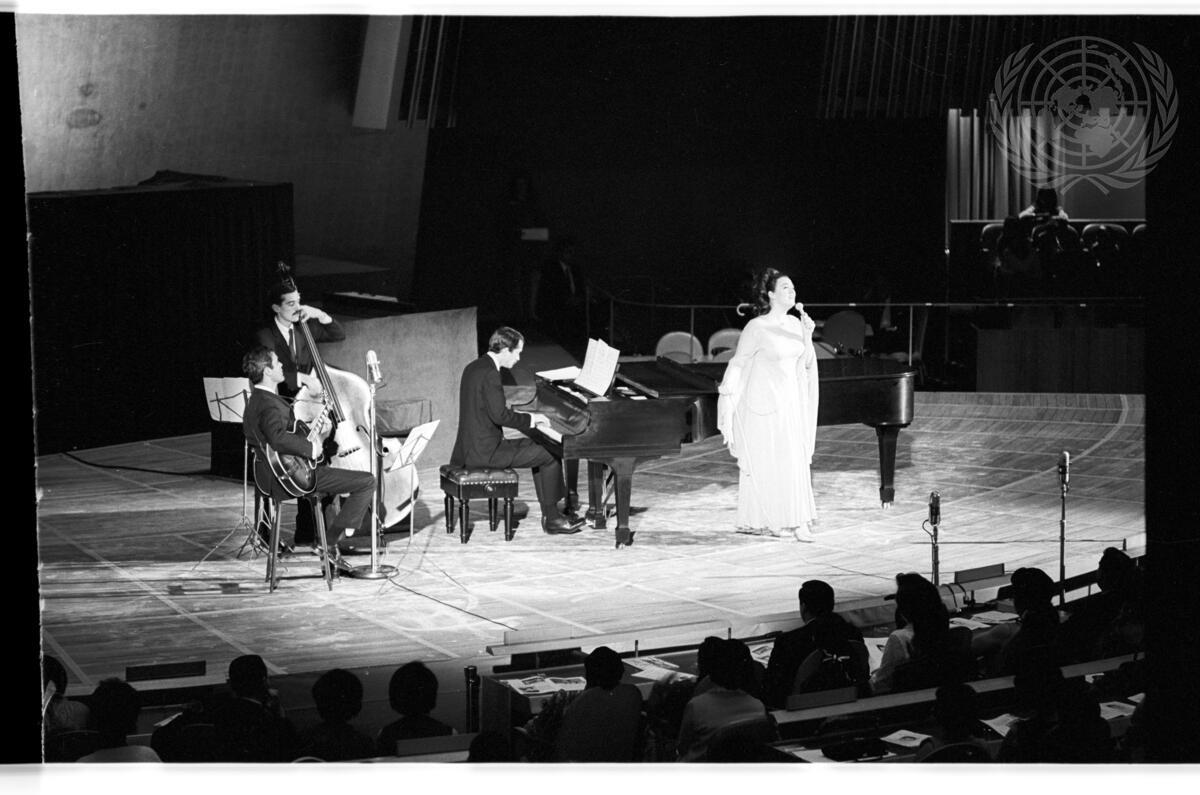 United Rations Secretariat staff today observed Staff Day by attending a special performance in the General Assembly building which featured several famous personalities from the concert and entertainment worlds. In the absence of UN Secretary-General U Thant, Mr. C. V. Narasimhan read a statement on his behalf and later acted as Master of Ceremonies. Making special guest appearances were: Pilar Lorengar, soprano from the Metropolitan Opera; Mstislav Rostropovich, Soviet cellist; Morgana King, popular singer; The Manhattan Festival Ballet; The Wild Ones, a rock-and-roll group. The evening dance in the General Assembly lobby featured singer Tony Bennett as special guest star with the Thad Jones-Mel Lewis All-Star Orchestra.