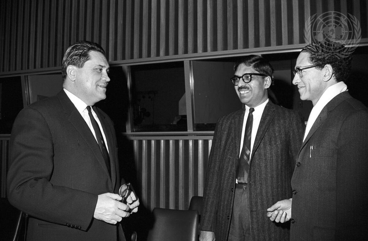 Before the meeting (left to right): Mr. Aleksei E. Nesterenko, UN Under-Secretary for Political and Security Council Affairs; Mr. E.S. Reddy, Committee Secretary; and Mr. Dennis Brutus, who is the director of a campaign launched by the International Defence and Aid Fund for the release of all political prisoners in South Africa.