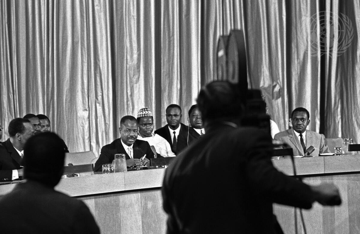 The President of the Federal Republic of the Cameroon, Almadou Ahidjo, addressed the General Assembly during his visit to the United Nations. His visit was filmed by the UN Film Unit. This took place while the President was being interviewed by the Press.
