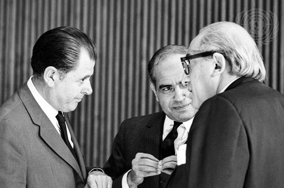 Seen here before the start of the meeting was Sr. Patricio Aylwin, chairman of Chile's delegation, talking with Muhammad H. El-Farra, Jordan's Permanent Representative to the UN and Sr. Jose Pinera, Chile's Permanent Representative to the UN.