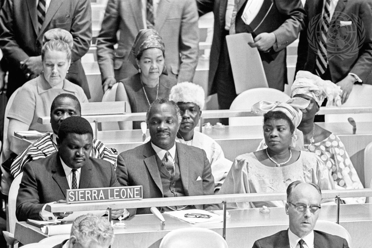 Seen here is the delegation from Sierra Leone with Cyril P. Foray, Foreign Minister and chairman of his country’s delegation to the UN, seated on the left behind his country’s nameplate.