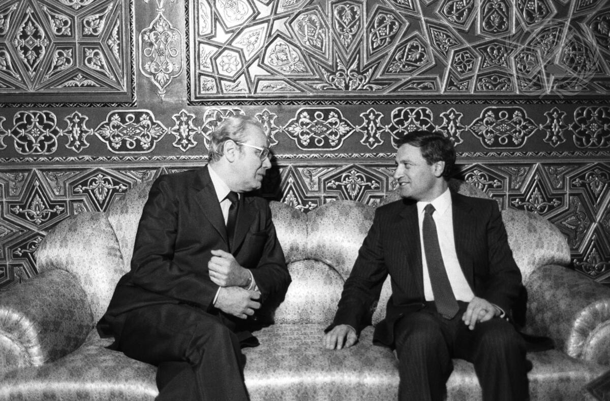 Secretary-General Javier Perez de Cuellar (left) meeting with Syria’s Foreign Minister Farouk al-Shara at the Foreign Ministry today.
