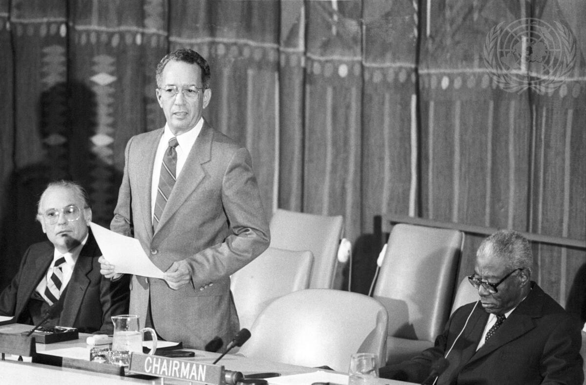 President Salvadore Jorge Blanco (standing) addressing the Latin American Group in the Economic and Social Council Chamber today. Others at the presiding table are, from left, UN Ambassador Eladio Knipping-Victoria of the Dominican Republic; Latin American Group Chairman Sir Egerton Richardson (Jamaica).