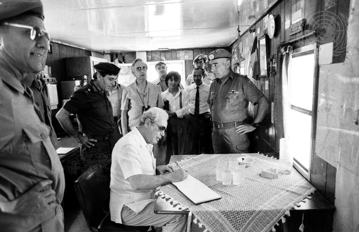 Secretary-General signing the visitors' book at Camp Faouar, Headquarters of the Austrian contingent, during his visit here today to inspect the United Nations Disengagement Observer Force (UNDOF). At left is UNDOF Commander Major-General Carl-Gustaf Stahl. Also present is (in dark glasses) Under-Secretary-General Brian Urquhart.