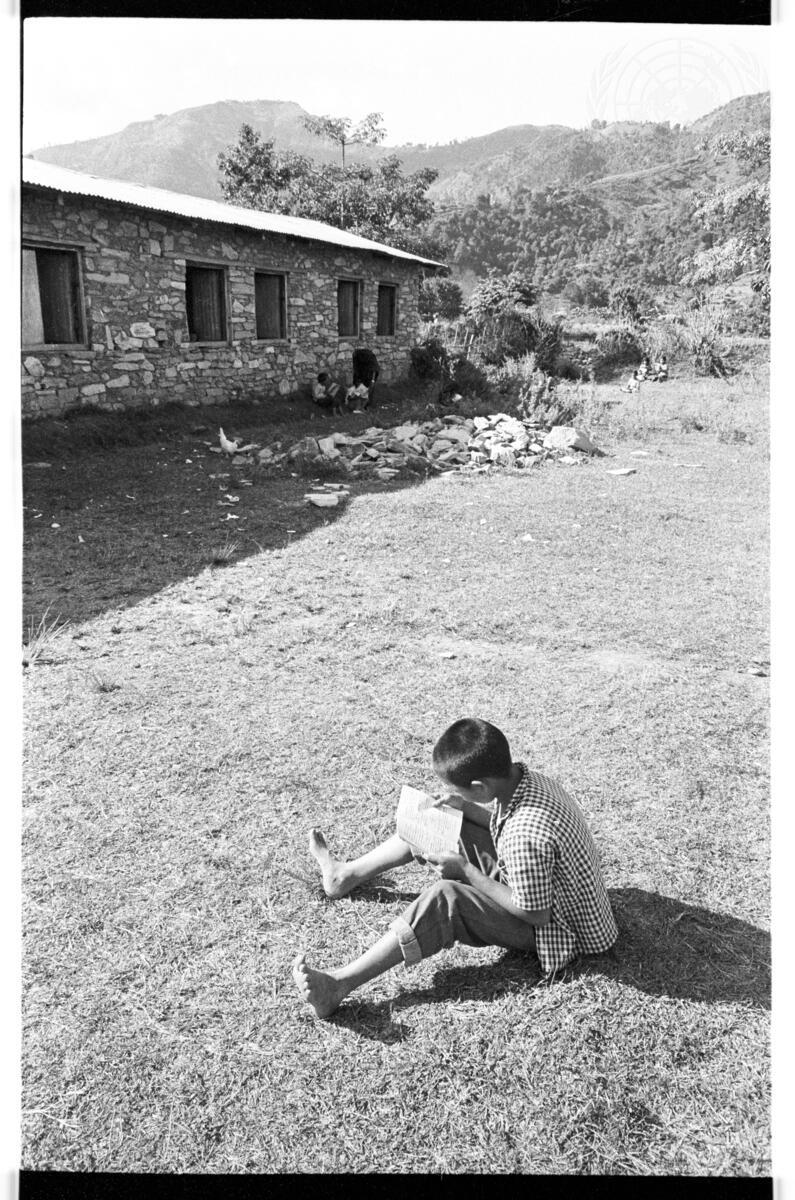A young boy studies in the sun outside the school of the Tashi Ling Tibetan Refugee Settlement at Pokhara in Nepal.