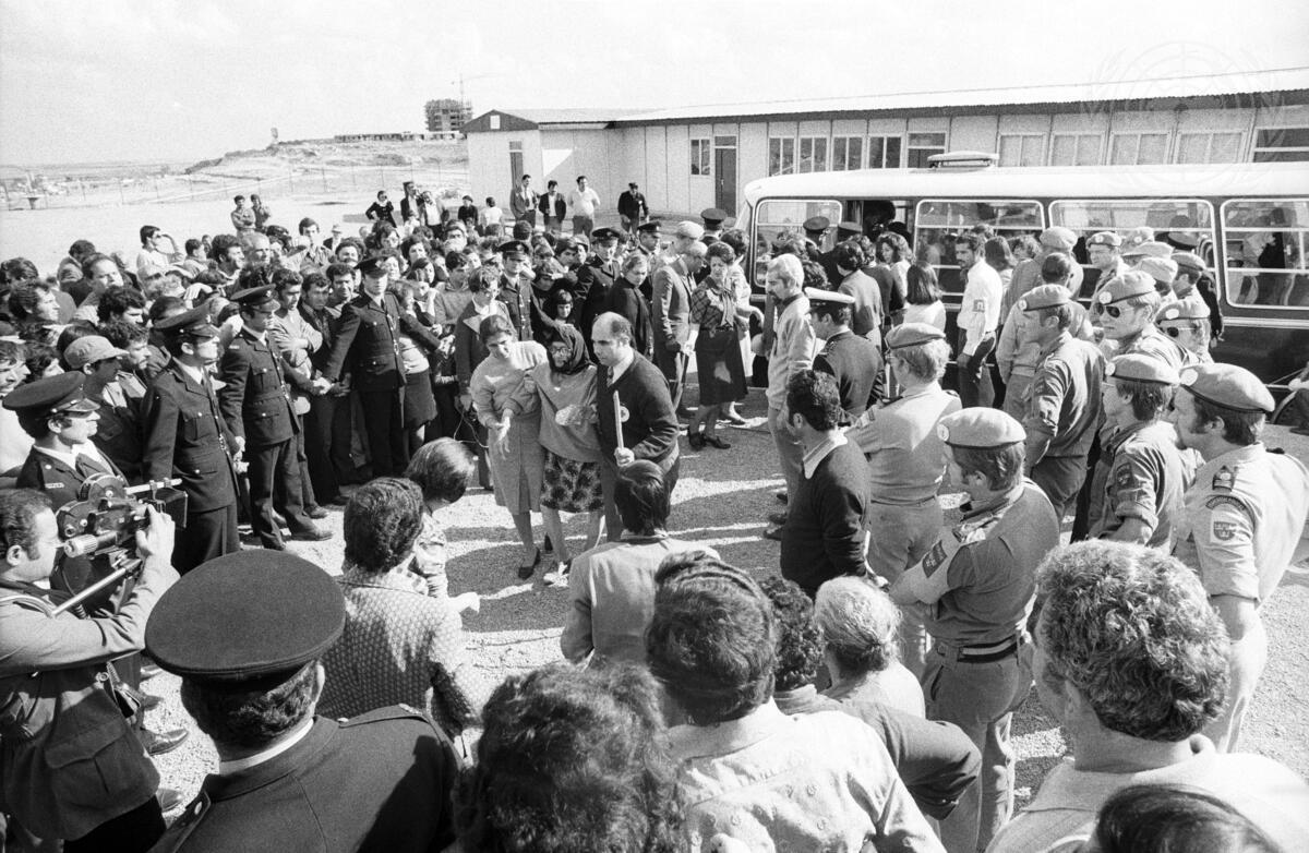 As a result of talks held on 11 November between the leaders of the two communities, about 1100 Greek Cypriots are being evacuated from the villages of Gypsos and Vone in the Famagusta district. Here, elderly evacuees from the village of Gypsos are seen being helped by members of the Cyprus Red Cross upon their arrival at the Hotel and Catering Institute in Nicosia on UN charted buses.