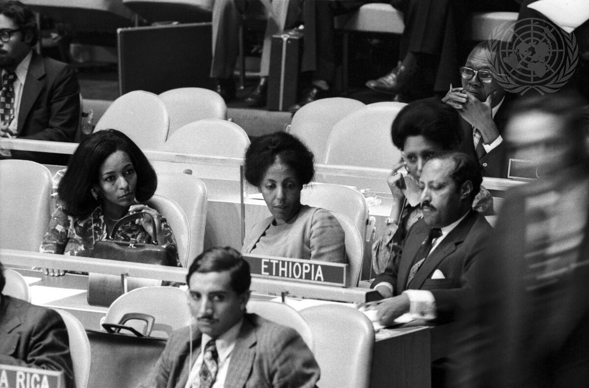 Members of the Ethiopian delegation to the 29th session of the General Assembly, headed by Zewde Gabre-Sellassie, Minister for Foreign Affairs. Yodith Imru, centre, was one of only three deputy heads of delegation to the session. There were only two women heads of delegations. (The organization now has 138 Members.) Konjit Sine-Giorgis, left, was an alternate representative. [October 1974]