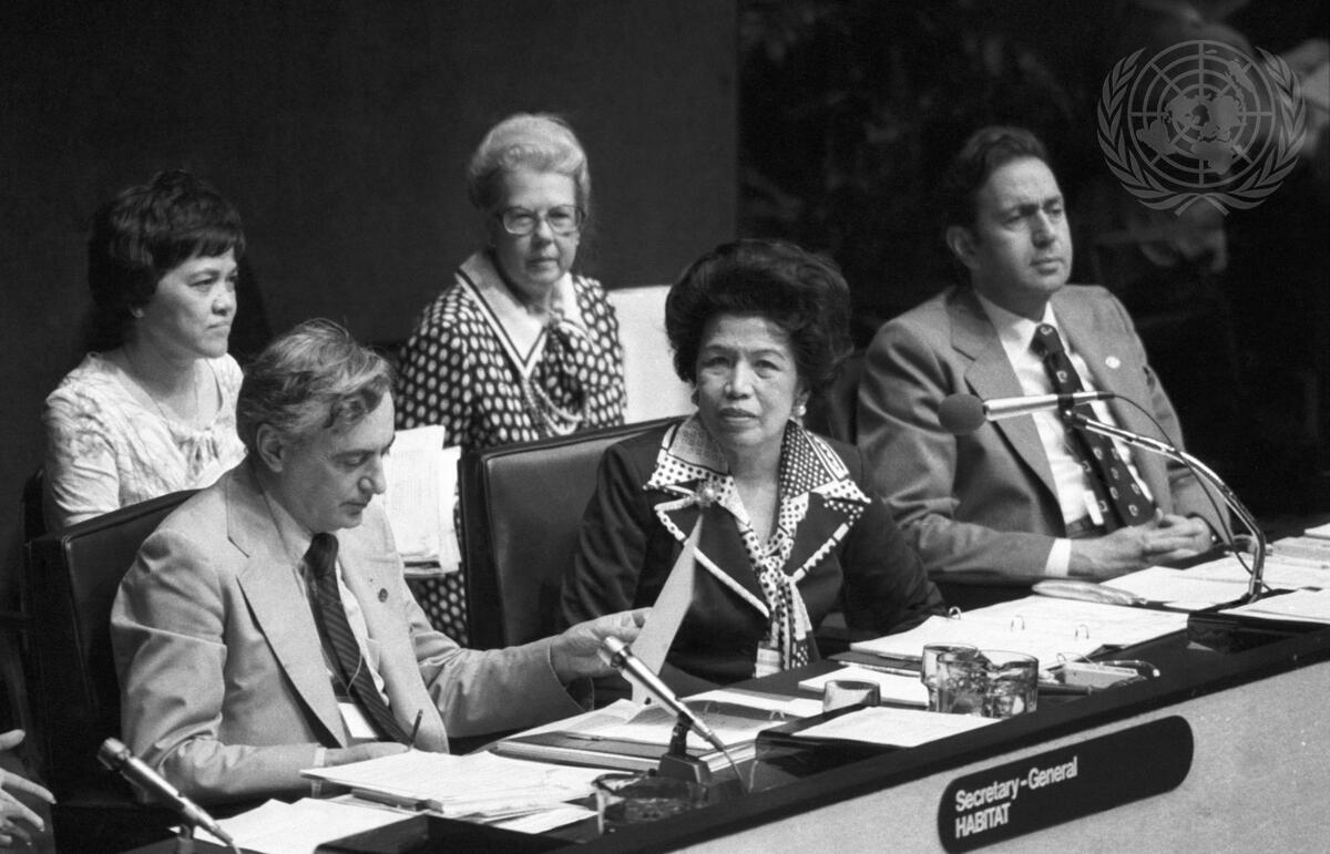 Conference Vice-President Helena Benitez (Philippines) presides over a portion of this morning's plenary meeting held in the Queen Elizabeth Theatre. At left is Duccio Turin, Deputy Secretary-General of Habitat; and at right is Uner Kirdar, Secretary of the Conference.