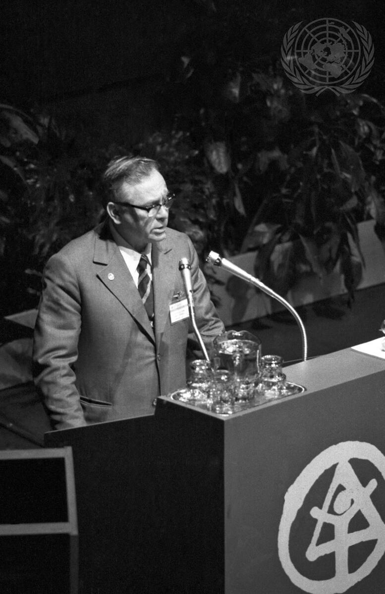 Guennadiy K. Zlobine of the Ukraine addressing this morning's plenary meeting of the Conference held in the Queen Elizabeth Theatre.