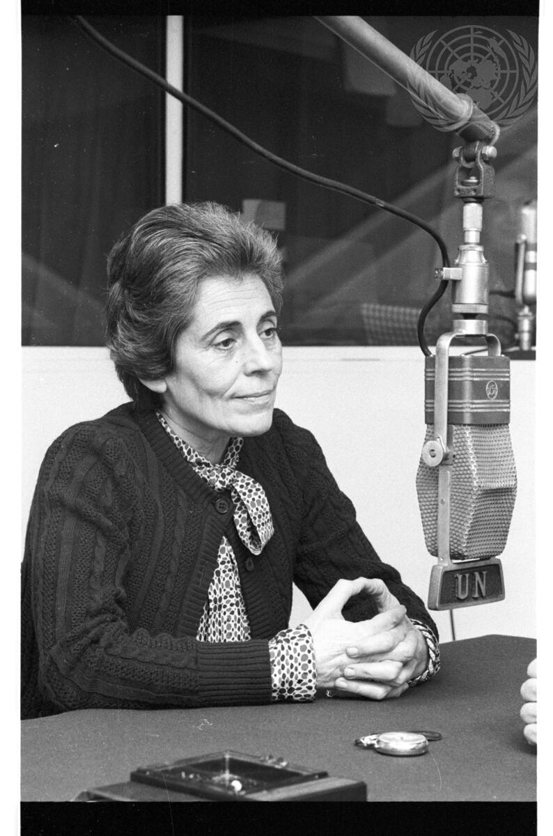Madame Francoise Giroud, French Minister for Women’s Affairs, being interviewed on UN Radio on 6 March. Madame Giroud was at Headquarters for meetings of the Consultative Committee for the World Conference of International Women’s Year. Women are still conspicuous by their absence at high levels of government. Madame Giroud is the first woman to head the first Ministry for Women’s Affairs.