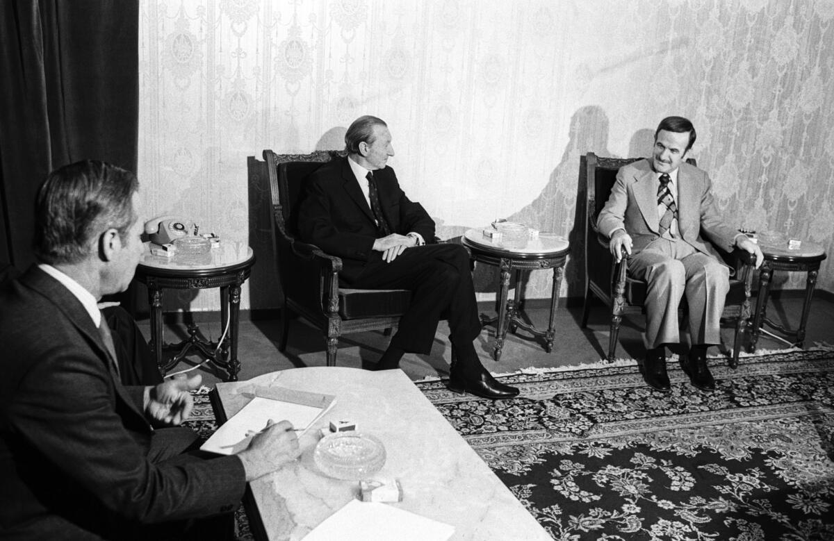 Secretary-General Kurt Waldheim is seen as he met with President of Syria, Hafez al-Assad, at the Presidential Palace in Damascus.