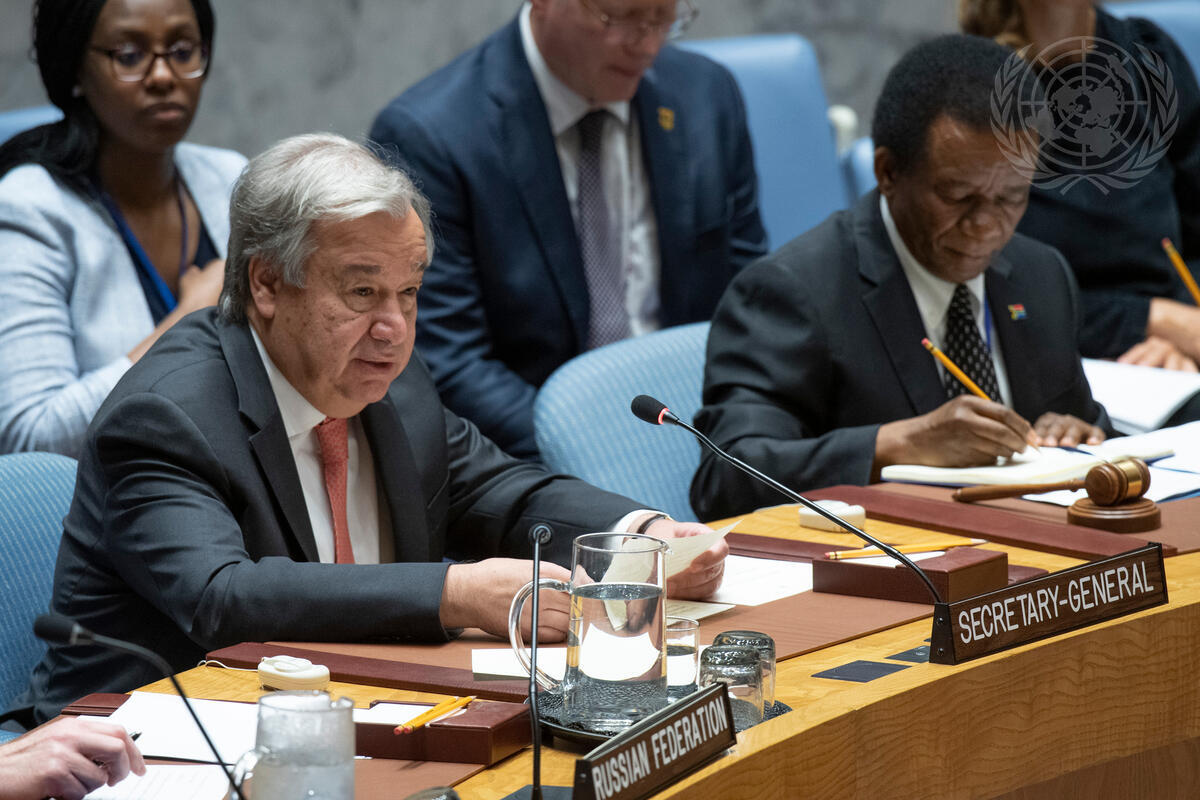 Secretary-General António Guterres briefs the Security Council meeting on the centrality of preventative diplomacy, conflict prevention and resolution, under the topic of peace and security in Africa. At right is Jerry Matthews Matjila, Permanent Representative of the Republic of South Africa to the United Nations and President of the Security Council for the month of October.