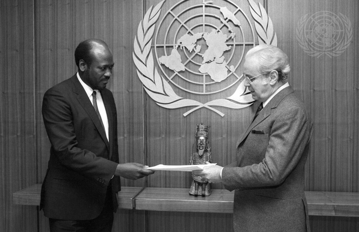 Ambassador Isack S.G. Mudenge of Zimbabwe Presents Credentials to Secretary-General Javier Perez de Cuellar