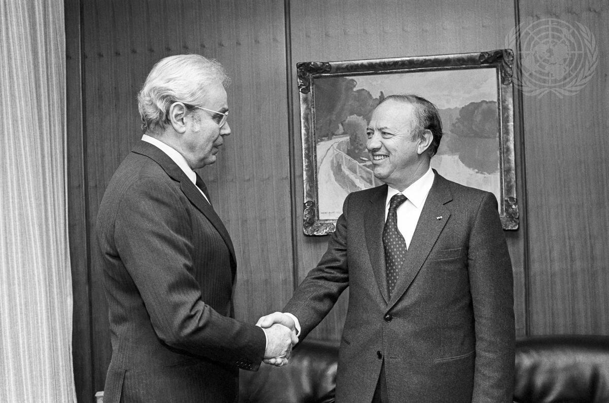 Secretary-General Javier Perez de Cuellar (left) today met at United Nations Headquarters with the Minister for Foreign Affairs of Tunisia, Béji Caid Essebsi, who is here to address the 39th session of the General Assembly.
