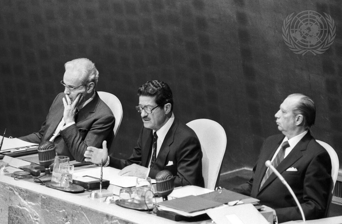 Jaime de Pinies (Spain) centre, addressing the Assembly shortly after his election as President of the 40th Regular Session of the General Assembly. Looking on are Secretary-General Javier Perez de Cuellar (left) and Under-Secretary-General for Political and General Assembly Affairs, William B. Buffum (right).