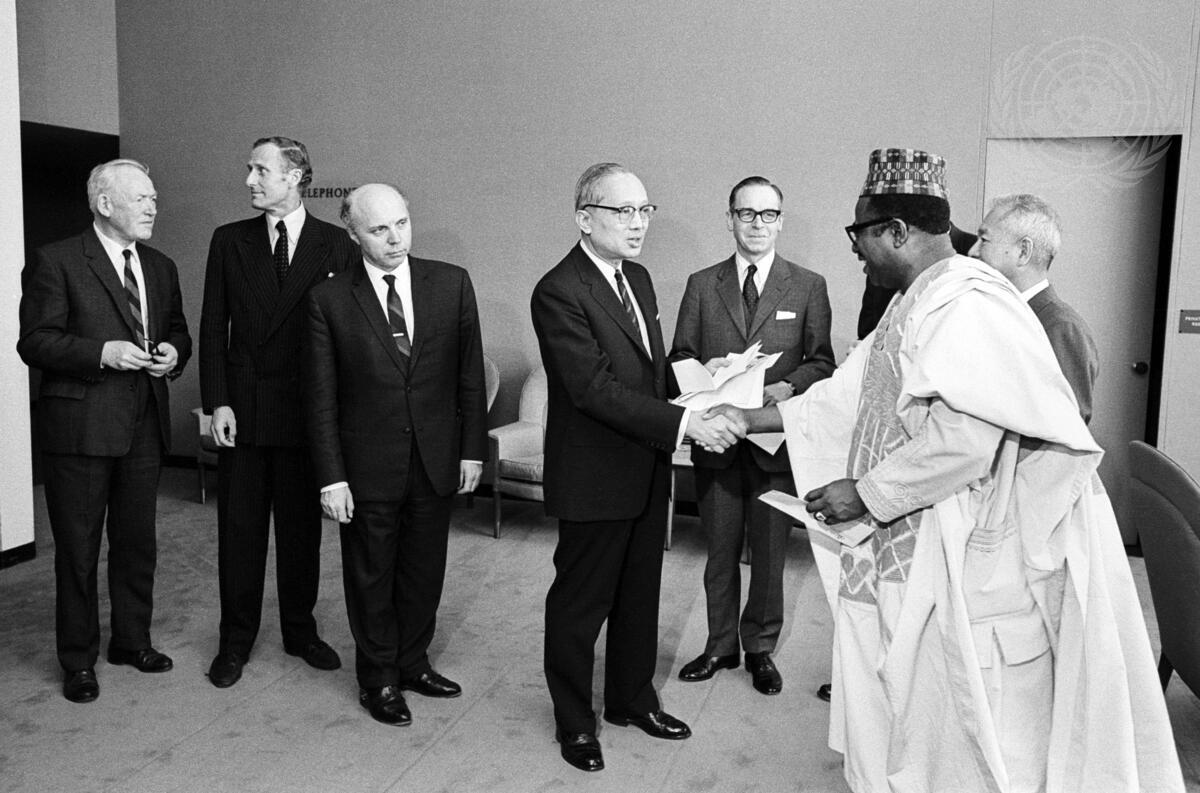 Edwin Ogebe Ogbu (Nigeria) presenting his Government’s contribution to Secretary-General U Thant during a ceremony to mark the International Day for the Elimination of Racial Discrimination. The contributions and pledges will go to the United Nations Funds for “the victims of apartheid and racism in South Africa”.