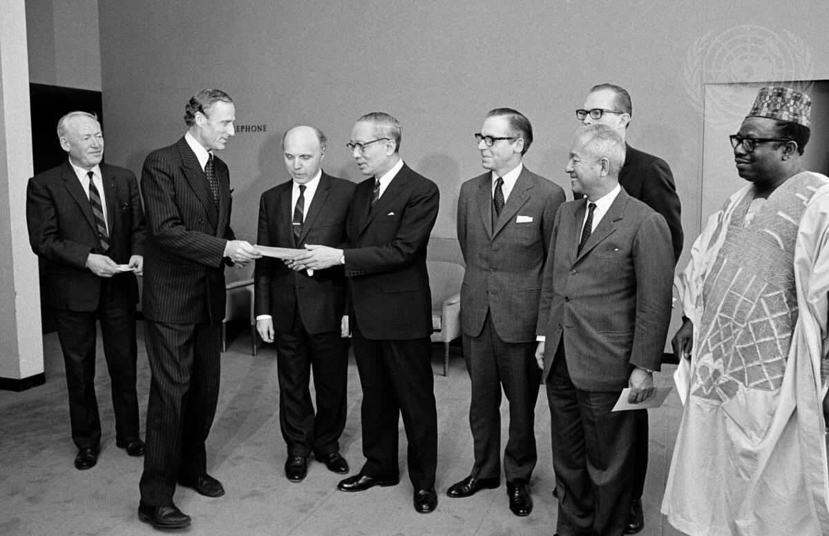 Sverker C. Astrom (Sweden) presenting his Government’s contribution to Secretary-General U Thant during a ceremony to mark the International Day for the Elimination of Racial Discrimination. The contributions and pledges will go to the United Nations Funds for “the victims of apartheid and racism in South Africa”.