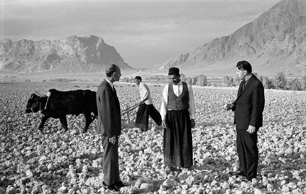 FAO Agricultural Vocational Training expert, B. Jercovic (Yugoslavia) (right), with his Iranian counterpart, N. Soroya (left), talk with a farmer in the fields of the village Dastena near Isfahan. Both men conduct research in the 14 villages covered by the Project, to produce the curricula which will be based on farming, for the adult literacy classes. [1968]